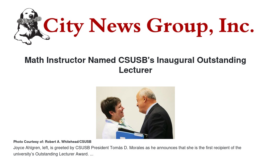 Morales told the students in the Math 301B class that Ahlgren won CSUSB’s inaugural Outstanding Lecturer Award.