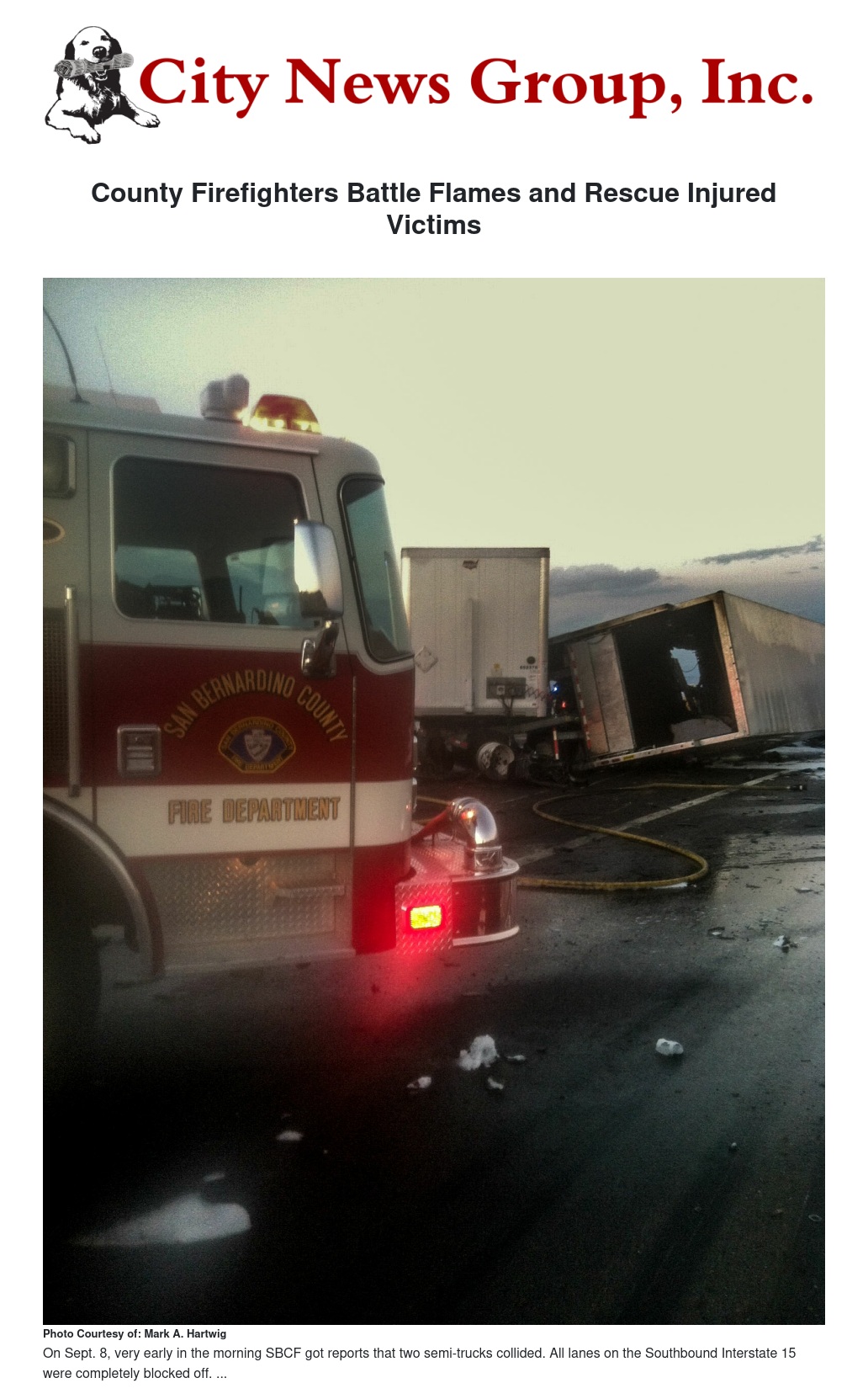 One semi hauling paper was fully involved with fire. County Fire initiated an aggressive fire attack, while Baker Ambulance confirmed there were no injuries. While County firefighters were engaged in fire attack, a second call came in reporting a traffic collision with subjects trapped on I-15 just south of the present incident.