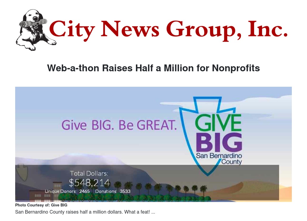 The Give BIG San Bernardino County web-a-thon raised a total of $548,214 from 2,465 individuals making 3,533 donations to the participating 262 nonprofits throughout our county, exceeding the goal of raising $300,000. These nonprofits offer a variety of services from education to healthcare to recreational activities.