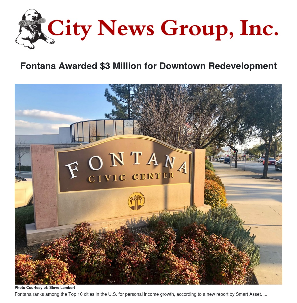The City of Fontana has been awarded funding from the State of California to support the planning of a major redevelopment of the downtown core, featuring expanded arts and cultural venues, an anchor hotel, new stores, restaurants and microbreweries, and affordable and market-rate housing to serve the fastest-growing city in San Bernardino County.