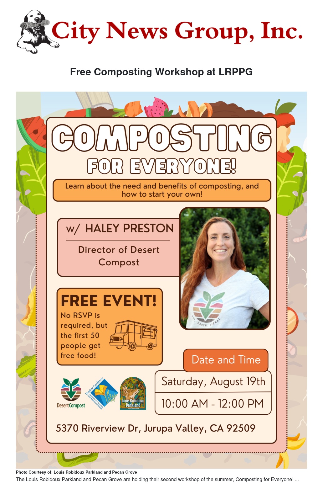 “There are a million and one reasons to compost!” said Haley Preston, founder and director of Desert Compost. “Beginning composters will immediately see reduced food waste, but in the long run, they will also benefit from improved soil health, lower water needs, and will have access to a growing network of friends and resources in their local composting network. Communities who compost can help each other to be successful and collectively increase local resilience to the impacts of climate change. I am so excited to help connect the Louis Robidoux Parkland and Pecan Grove community to the process and benefits of composting!”