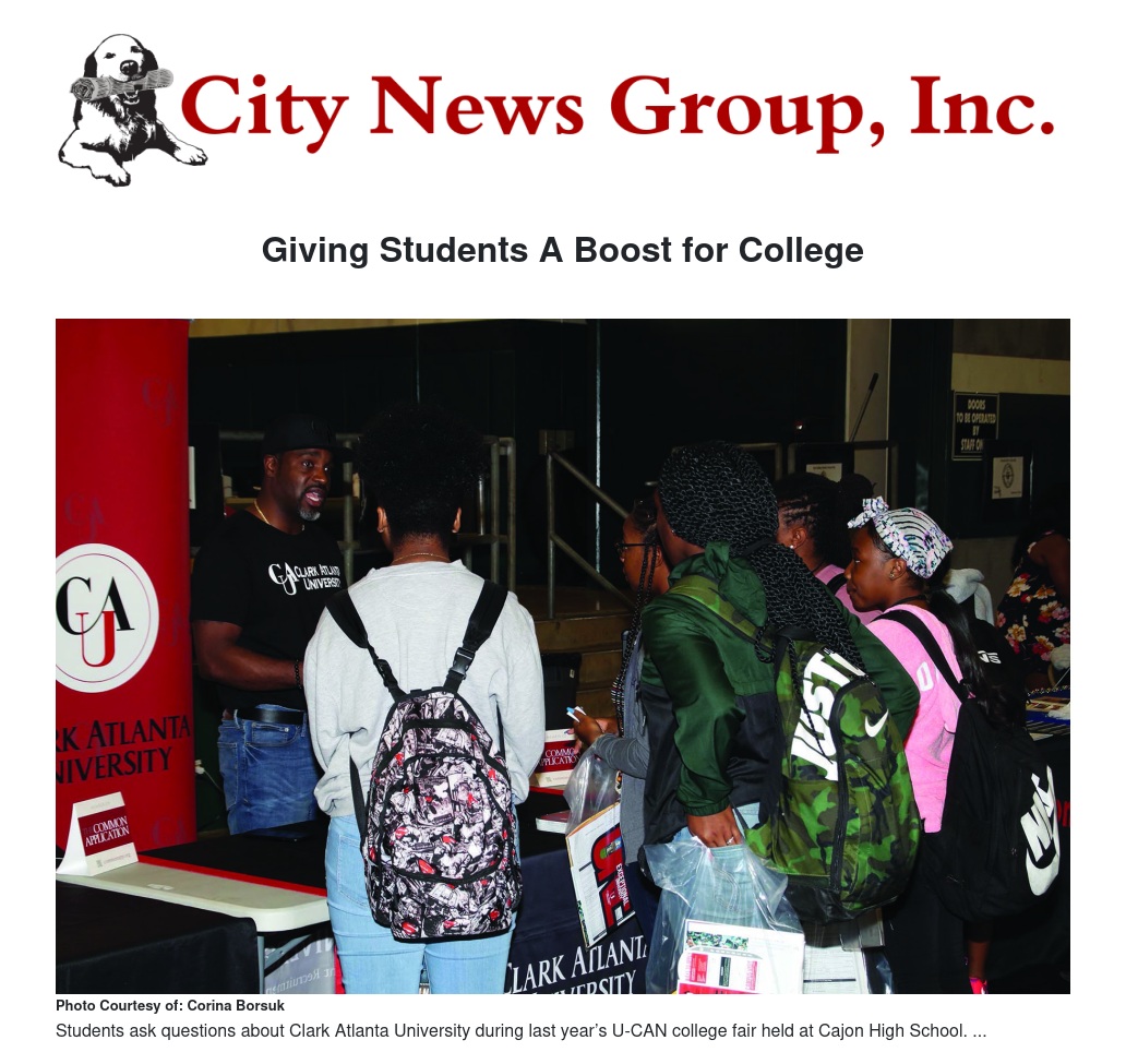 High school seniors can also attend the U-CAN (United College Action Network) college fair at Cajon High School on September 19, 8:15 a.m. to 12 noon. U-CAN is focused on connecting high school seniors with Historically Black Colleges & Universities (HBCUs). One of the benefits of U-CAN is that select high school seniors may receive on-the-spot scholarships or admission to HBCUs. Students must bring a copy of their current transcripts to the U-CAN college fair to qualify.