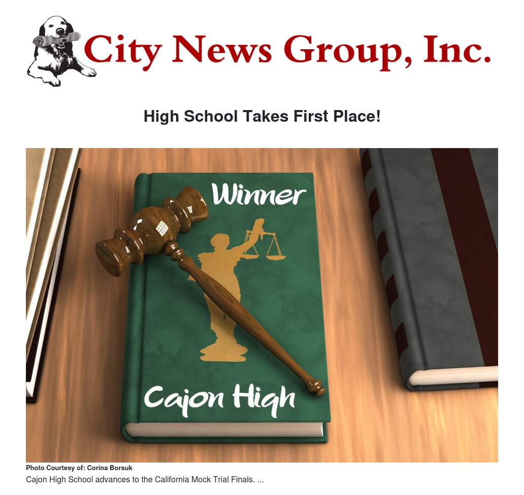 The Cajon High School Cowboys took first place in the 39th Annual San Bernardino County Mock Trial finals. Cajon now advances to the California Mock Trial Finals scheduled for March 18–21, 2021.