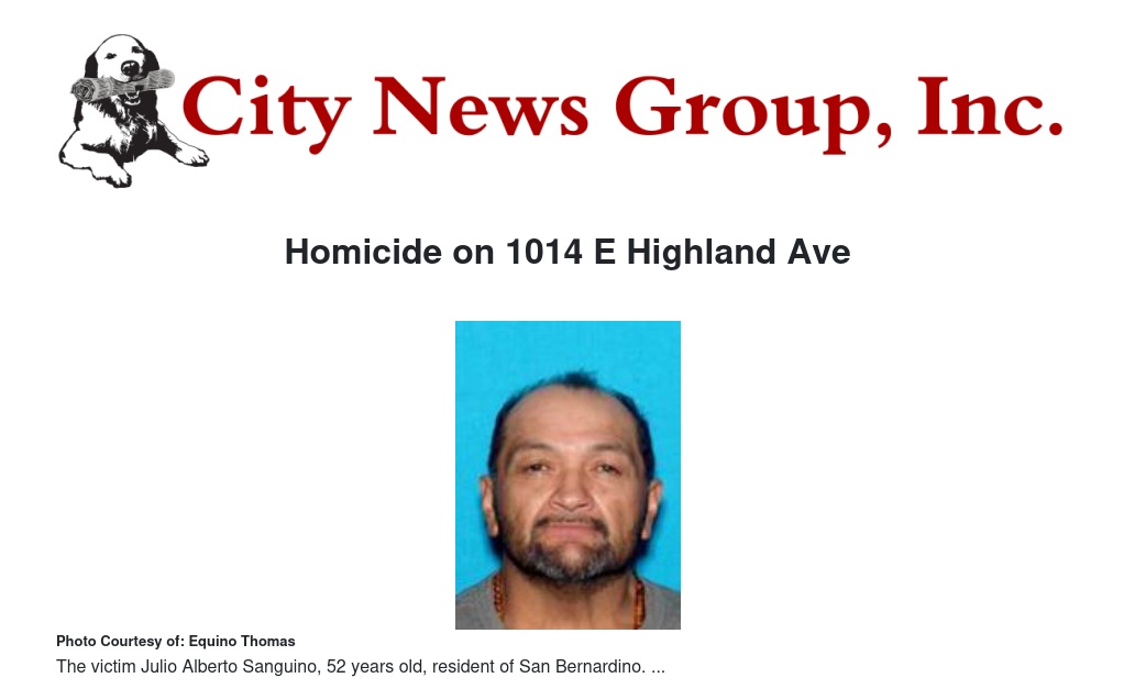 On January 30, 2022, at approximately 0201 hours, San Bernardino Police call center received 911 calls regarding a shooting. Patrol officers were dispatched to 1014 E. Highland Avenue regarding a shooting victim. The victim was transported to a local hospital and treated by medical staff where he succumbed to his injuries. Officers responded and conducted an investigation. Based on witness statements, Sanguino was shot after leaving Los Arcos Mexican Restaurant (934 East Highland Avenue). Witnesses were interviewed and the investigation is ongoing. Currently, there are no additional witnesses that have come forward with information. Detectives are attempting to identify a suspect and are asking for assistance from the community.