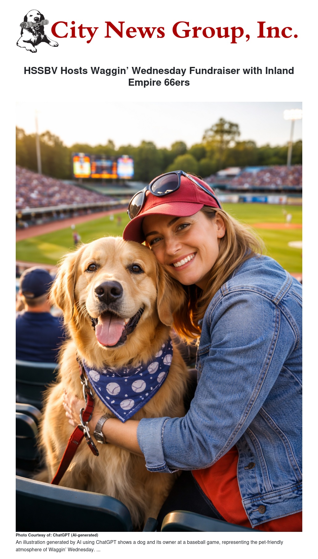 The Humane Society of San Bernardino Valley (HSSBV) invites the community to enjoy a fun-filled evening, at the Inland Empire 66ers's Baseball “Waggin’ Wednesday” game, on Wednesday, April 8, 2026, beginning at 6:35P.M. Waggin’ Wednesday is a special fan-favorite event that allows attendees to bring their dogs to the ballpark for a unique night of baseball and pet-friendly fun—one of the few chances all season to share the ballpark experience with your pup!