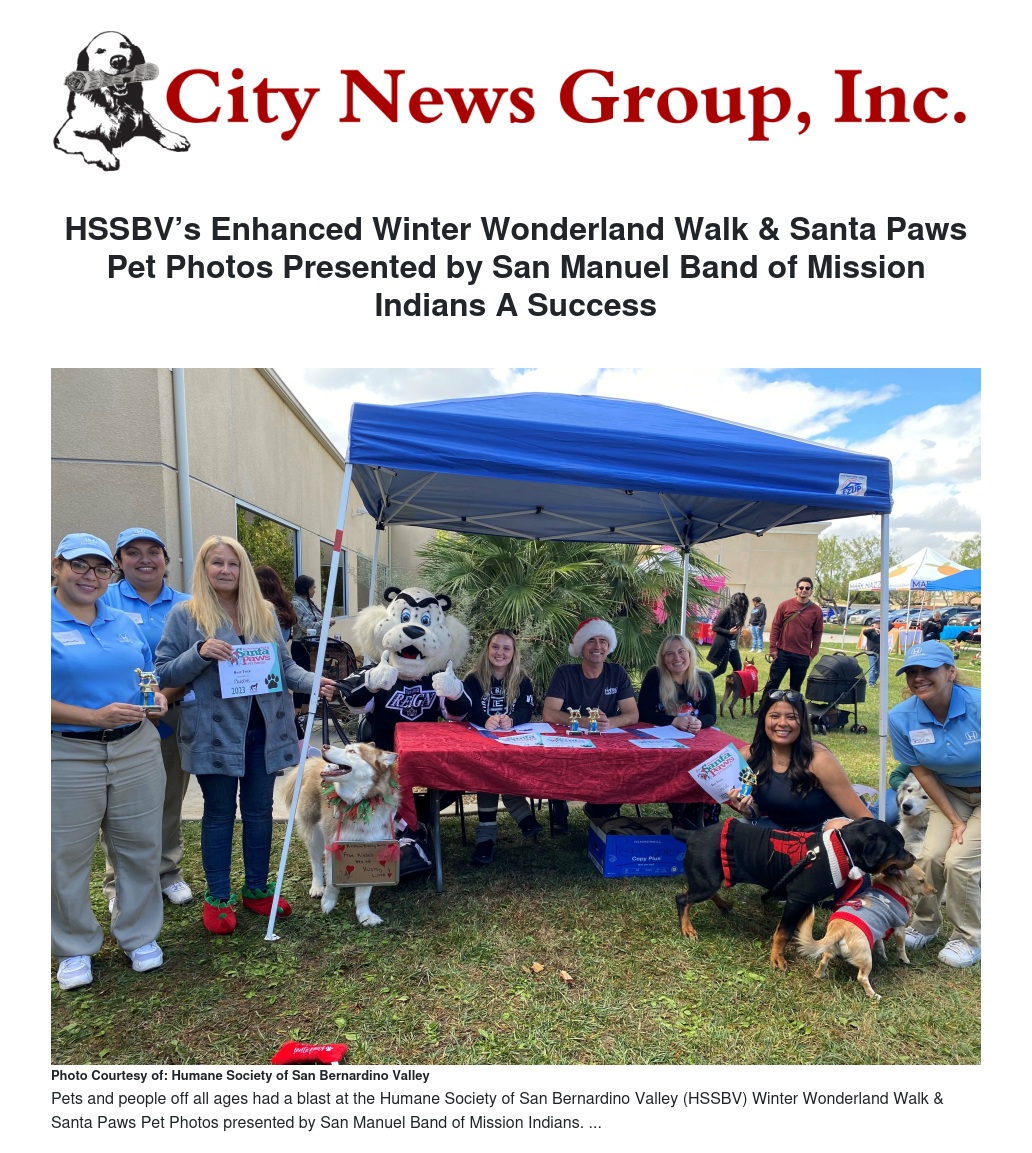 – Pets and people off all ages had a blast at the Humane Society of San Bernardino Valley (HSSBV) Winter Wonderland Walk & Santa Paws Pet Photos presented by San Manuel Band of Mission Indians. Over $13,300 was raised to help animals in our community. This event, formerly Santa Paws Pet Photos & Holiday Boutique, had all of the fun of the regular photos with Santa, combined with everything you loved about the Spring Walk for the Animals and even more!