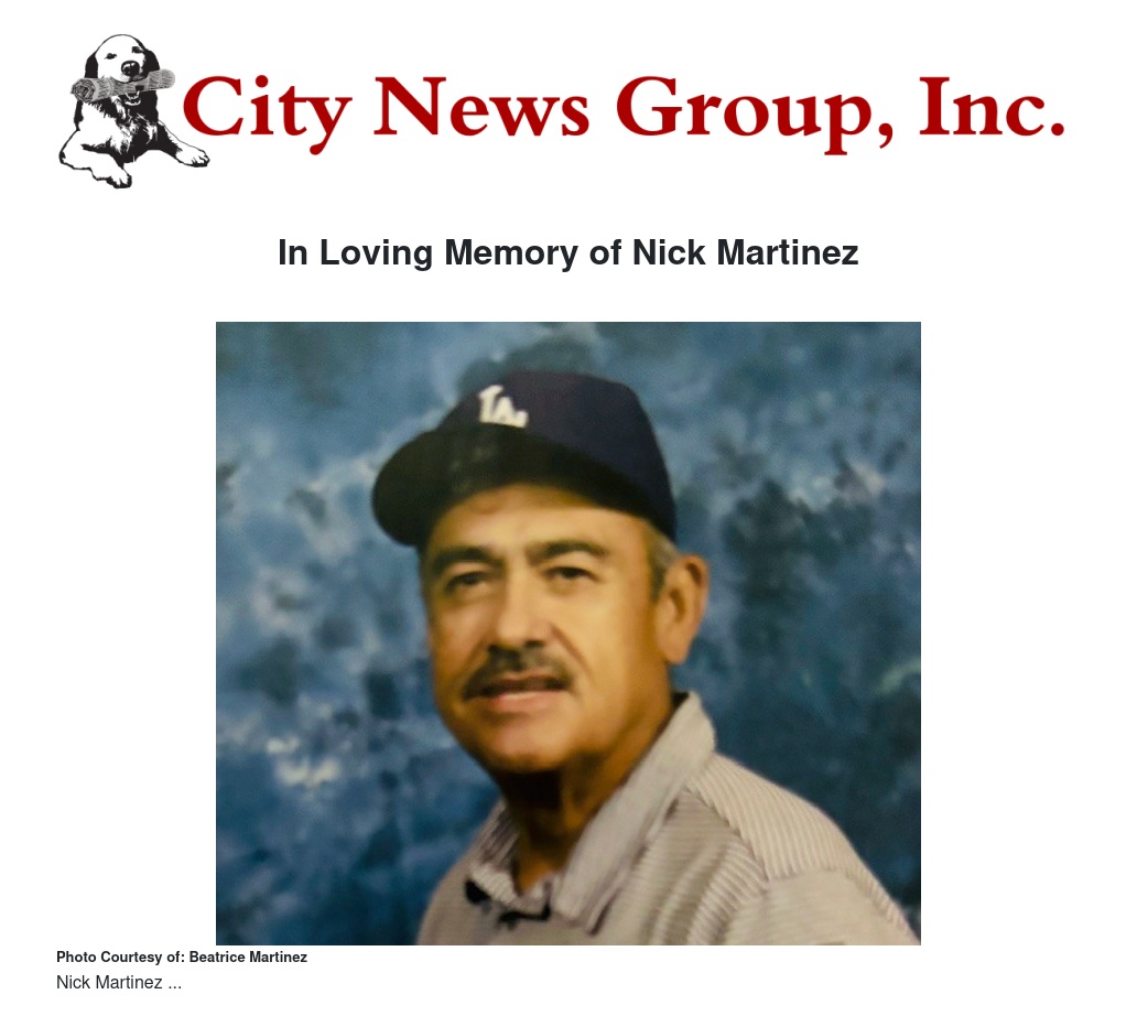 With heavy hearts, we announce the passing of Big Nick Martinez, a beloved husband, father, grandfather, brother, and friend. Nick passed away surrounded by his loved ones, leaving behind a legacy of love, laughter, and cherished memories. Nick was the luckiest man, always Mr. Popular, Mr. All American, the great athlete, straight teeth, tall, good-looking, and smart. He had it all. If you were fortunate enough to watch Nick play baseball or basketball, you would know he was fantastic on the baseball feld and on the basketball court. His 3 brothers and 1 sister had a front-row seat and enjoyed watching their big brother excel at sports. Always the dominant presence among family and friends, Nick was a force to be reckoned with. I never saw anyone hit a ball farther or play sports with more passion. He was also an avid fan of the Dodgers! Colton! And Stater Bros.! Nick was a great provider for the family he loved. He and his wife, Bea, were together for over 47 years. She was the best thing that ever happened to him along with his twins. He was so proud of his children, Nick and Veronica, and super proud of his grandchildren, Ecio, Teyo, and Archie. He expressed that love for them every time he spoke. He is probably doing it right now. His friends share great memories of their buddy, Nick, remembering the celebrations, BBQ's, and holidays that were shared together when neighbors became family; so many laughs, never a dull moment when they got together. We will treasure these memories forever in our hearts. Family and friends will surely miss Nick and his smile, but his legacy will live on in all of us. Nick, you will be deeply missed but forever remembered in our hearts. Nick is survived by his wife, Bea, twins Nick Jr. and Veronica, daughter-in-law Jackie and son-in-law Joe, grandchildren Ecio, Teyo, and Archie, brothers Edmond, Michael, and Tommy, and sister, Lorna. Mass will be held on Friday, August 23rd @ 11am at Christ the Redeemer Church in Grand Terrace, Ca. Eternal peace be with you. Goodbye. —