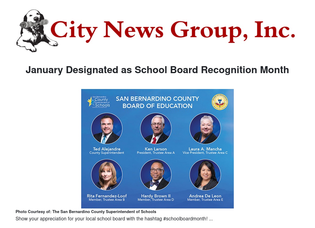 The San Bernardino County Board of Education adopted a resolution to acknowledge January as California School Board Recognition Month at their recent meeting on Jan. 4.