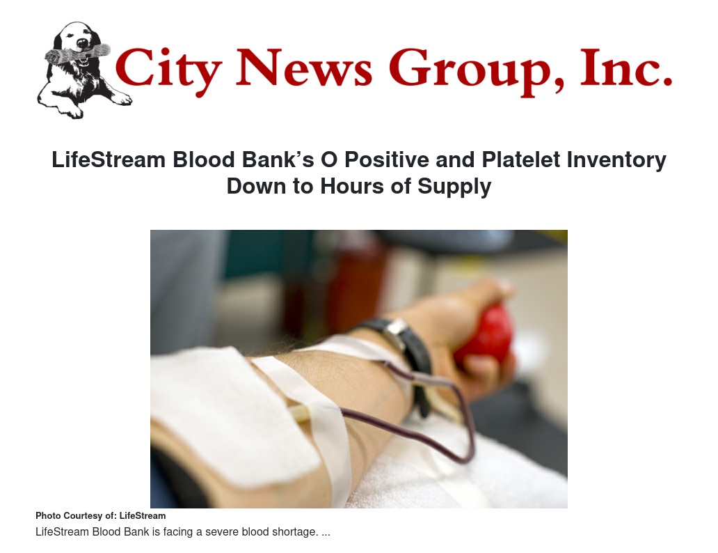 LifeStream Blood Bank’s O Positive and Platelet Inventory Down to Hours of Supply by Dina Colunga - City News Group, Inc.