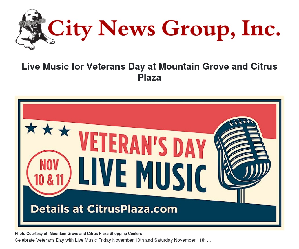 Live Music for Veterans Day at Mountain Grove and Citrus Plaza by Mountain Grove and Citrus Plaza Shopping Centers - City News Group, Inc.