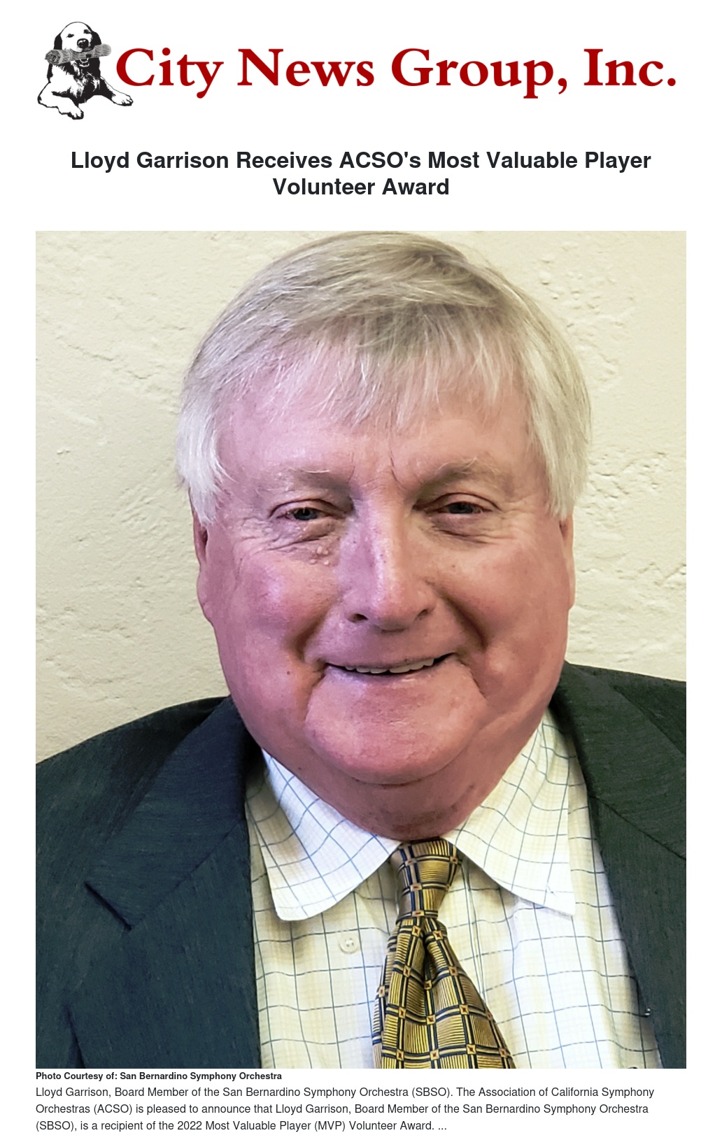The Association of California Symphony Orchestras (ACSO) is pleased to announce that Lloyd Garrison, Board Member of the San Bernardino Symphony Orchestra (SBSO), is a recipient of the 2022 Most Valuable Player (MVP) Volunteer Award.