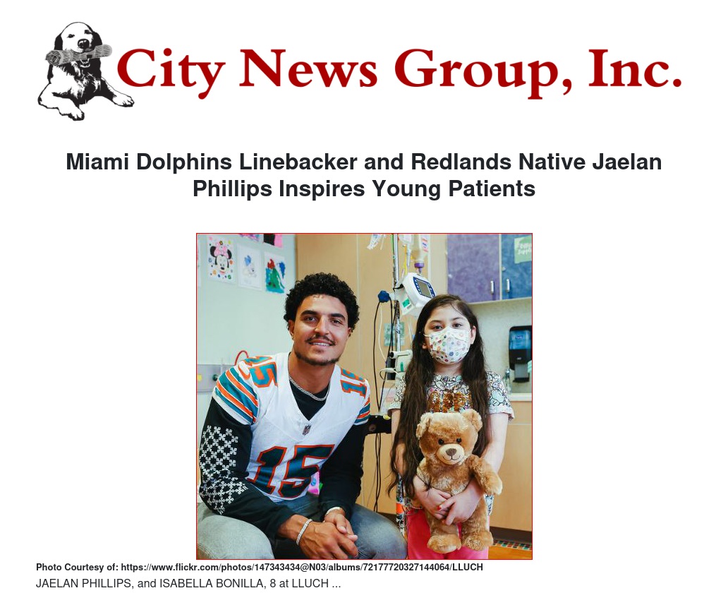 Miami Dolphins linebacker and Redlands native Jaelan Phillips visited Loma Linda University Children’s Hospital (LLUCH) on Tuesday, June 25, bringing smiles, encouragement and support to young patients facing serious medical challenges.