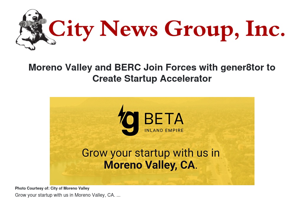 Moreno Valley and BERC Join Forces with gener8tor to Create Startup Accelerator by William Cortez - City News Group, Inc.