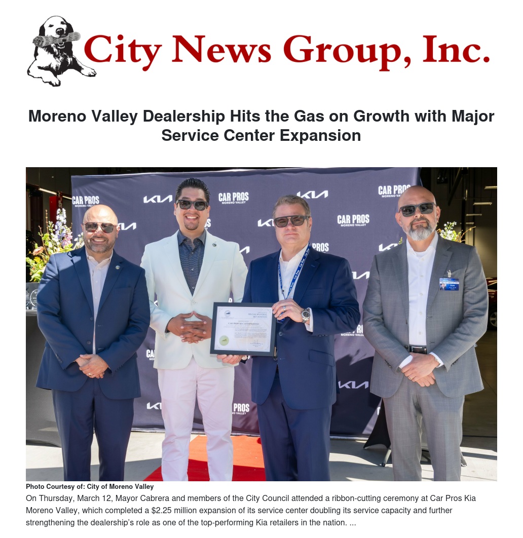 “Moreno Valley continues to attract major investments that create jobs and improve services for our residents,” said Mayor Ulises Cabrera. “This expansion at Car Pros Kia Moreno Valley reflects the strength of our local economy and the confidence businesses have in our community’s future.”