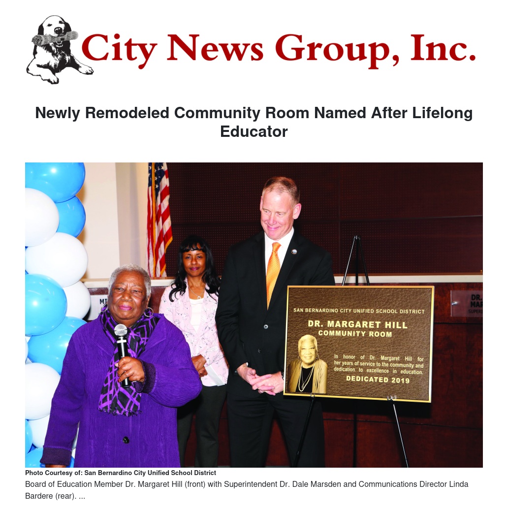 The San Bernardino City Unified School District held a ribbon cutting ceremony for its newly remodeled main administrative offices on Tuesday, December 10, and the event served as the perfect opportunity to rename the Community Room for longtime educator Dr. Margaret Hill.