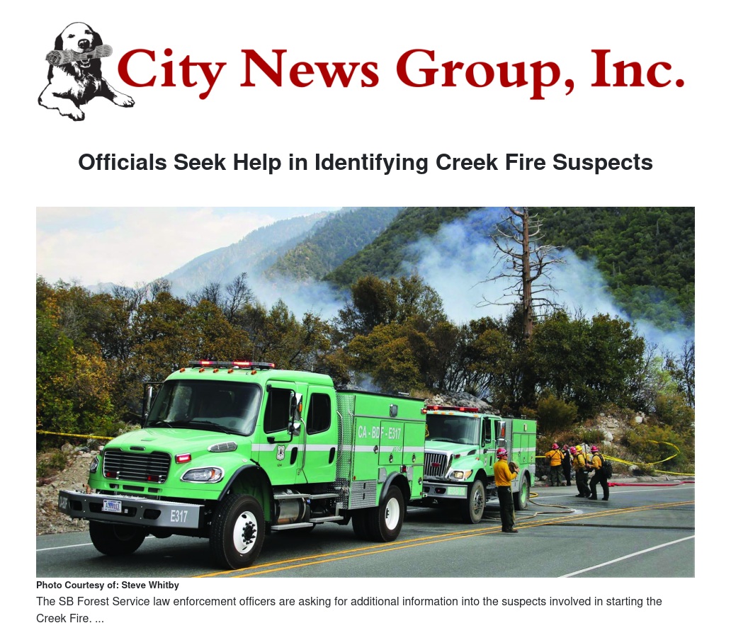 Officials with San Bernardino National Forest are asking for the public’s help in identifying a suspect or suspects involved in starting the Creek Fire. The 33-acre fire was first reported at 12:12 p.m. on Saturday, June 30, in the San Bernardino Mountains between the communities of Highland and Running Springs. It was started off U.S. Forest Service Road 1N09 (locally said with the letter “O”), a few miles east of Highway 330.