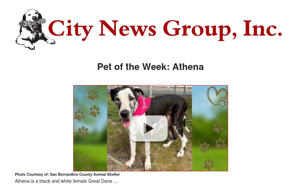 Meet our Pet of the Week: Athena (ID# A800112). Athena is a black and white female Great Dane and she is about two-years old. If you would like to meet Athena, come to the Devore Animal Shelter and ask to see ID# A800112. We’re open seven days a week.