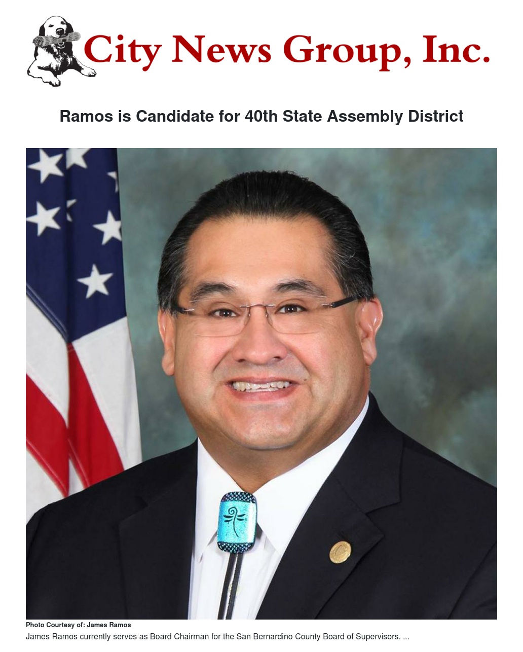 Supervisor James Ramos, a Democrat, has stated, “As a tribal leader, community leader, business owner, and a County Supervisor for the 3rd District of San Bernardino County, I have worked to make the County a better place to live and work, targeting corruption, heightened security within the different communities, bringing transparency to the County Board of Supervisors, overseeing the budget and providing a reserve for future ventures. My focus in the future will still be with economic development growth in the Inland Empire, getting a handle on the homeless population and what services we can provide for those in need, improving the education component throughout the County and District. Finally, provide a safe community for all families to work and play in on a daily basis.” Ramos has formed his campaign committee and is looking forward to running for the 40th State Assembly District seat.