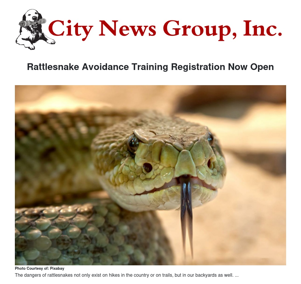 The Humane Society of San Bernardino Valley will be hosting Rattlesnake Avoidance Training on Friday, April 20th at their facility starting at 9:00 a.m. Training is provided by High on Kennels from Santa Ysabel, CA. Appointment registration for the training is open now and interested participants can pre-register and save $5 off of the $75 fee.