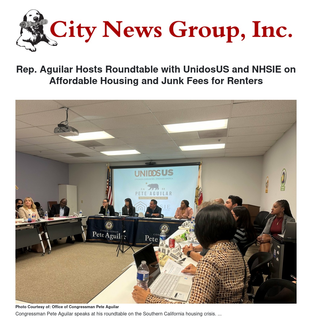 On Monday, August 7th, Rep. Pete Aguilar hosted a roundtable with representatives from UnidosUS and Neighborhood Housing Services of the Inland Empire (NHSIE) to discuss how California’s housing crisis is affecting the Latino community and the steps Congress has taken to address this crisis.