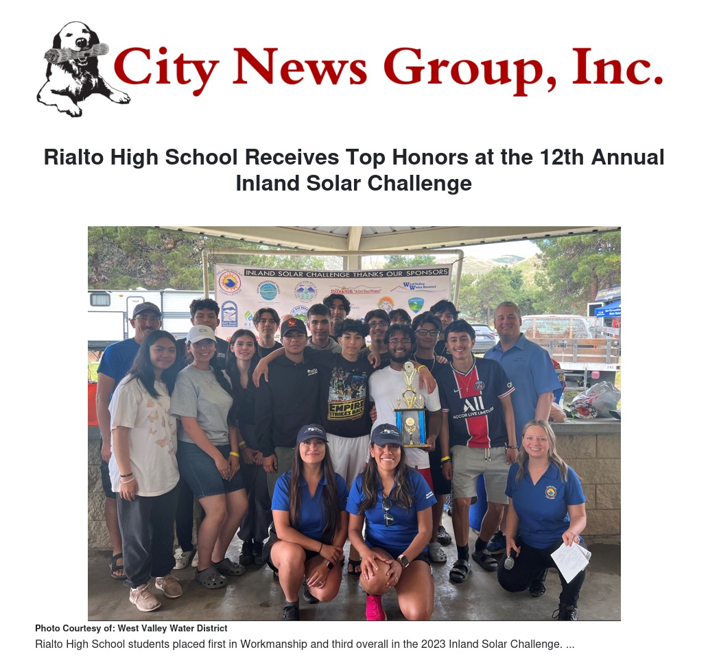 Rialto High School placed first in workmanship for their Lightning McQueen-inspired boat and third overall at the 12th annual Inland Solar Challenge (ISC). West Valley Water District (WVWD) sponsored Rialto High School for the challenge, which took place over three days at Yucaipa Regional Park.