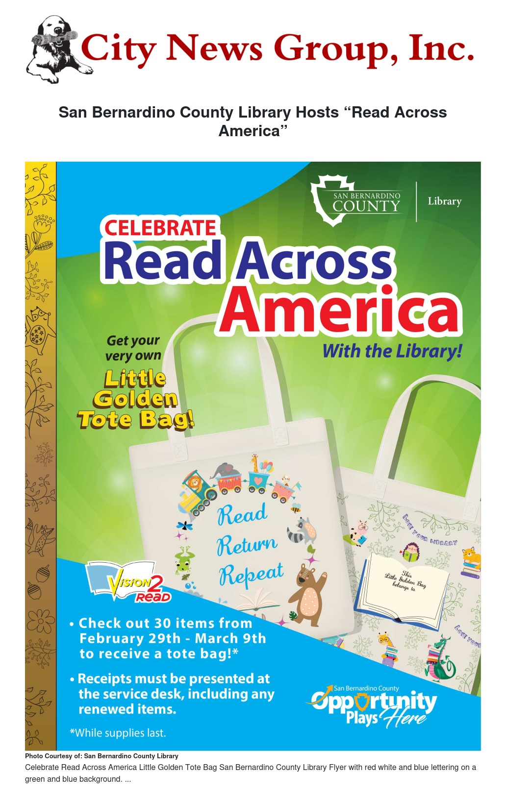 The San Bernardino County Library and all of its branches invite the public to join in celebration of Read Across America with special storytimes, circulation incentives and more. From Thursday, Feb. 29 through Saturday, March 9, customers who check out 30 items with their library card and present those checkout receipts at the service desk will receive a limited edition literary-themed canvas tote bag, a nod to the classic “Little Golden Books.”