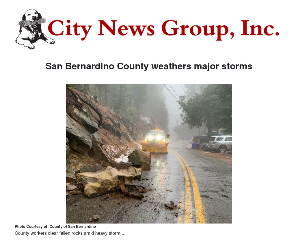 San Bernardino County emerged from this week’s historic rainstorms spared from the destruction endured by many other California communities, prompting county leaders to praise county departments and staff for the preparedness, coordination and public communication efforts undertaken before and during this potential disaster.