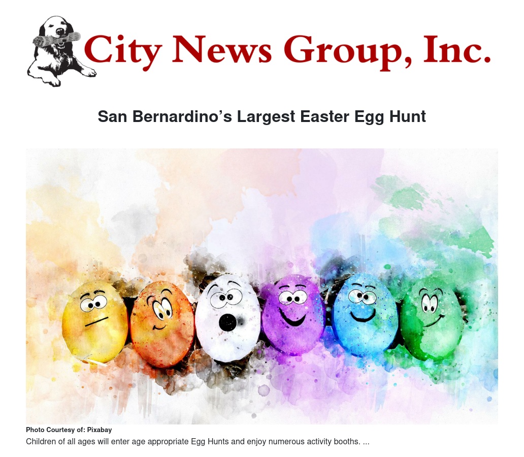 Children of all ages will enter age-appropriate Egg Hunts and enjoy numerous activity booths. This experience welcomes all residents of San Bernardino County.