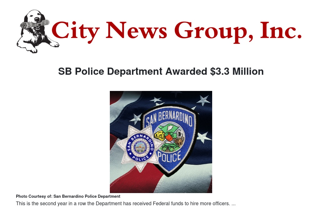 The San Bernardino Police Department recently received notice of an award by the United States Department of Justice Office of Community Oriented Policing (COPS) for $3,312,953 to hire an additional 8 police officers.