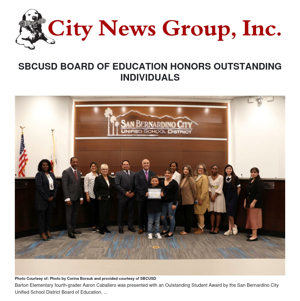 The Board of Education presented the Outstanding Achievement Awards to students, parents and staff of Barton and Gomez Elementary Schools, Arrowview Middle School and San Gorgonio High School (San G).