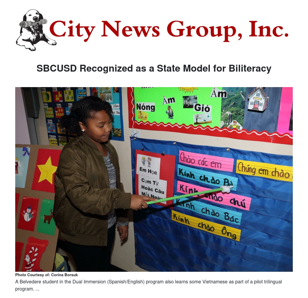 SBCUSD’s long history of valuing biliteracy and multilingualism, including the establishment of the successful Dual Immersion Program 19 years ago, are among the reasons for its selection. In addition, Californians Together highlighted the District’s launch of the Multilingual Initiative as a “bold plan to engage all students in high-level multilingual learning opportunities.” The state group also commended the introduction of the innovative, new Trilingual Immersion Program as evidence of the District’s pledge to encourage all students to reach high levels of proficiency in two or more languages. The trilingual program will fully launch at Belvedere Elementary School in August, promoting English, Spanish, and Vietnamese starting in kindergarten.