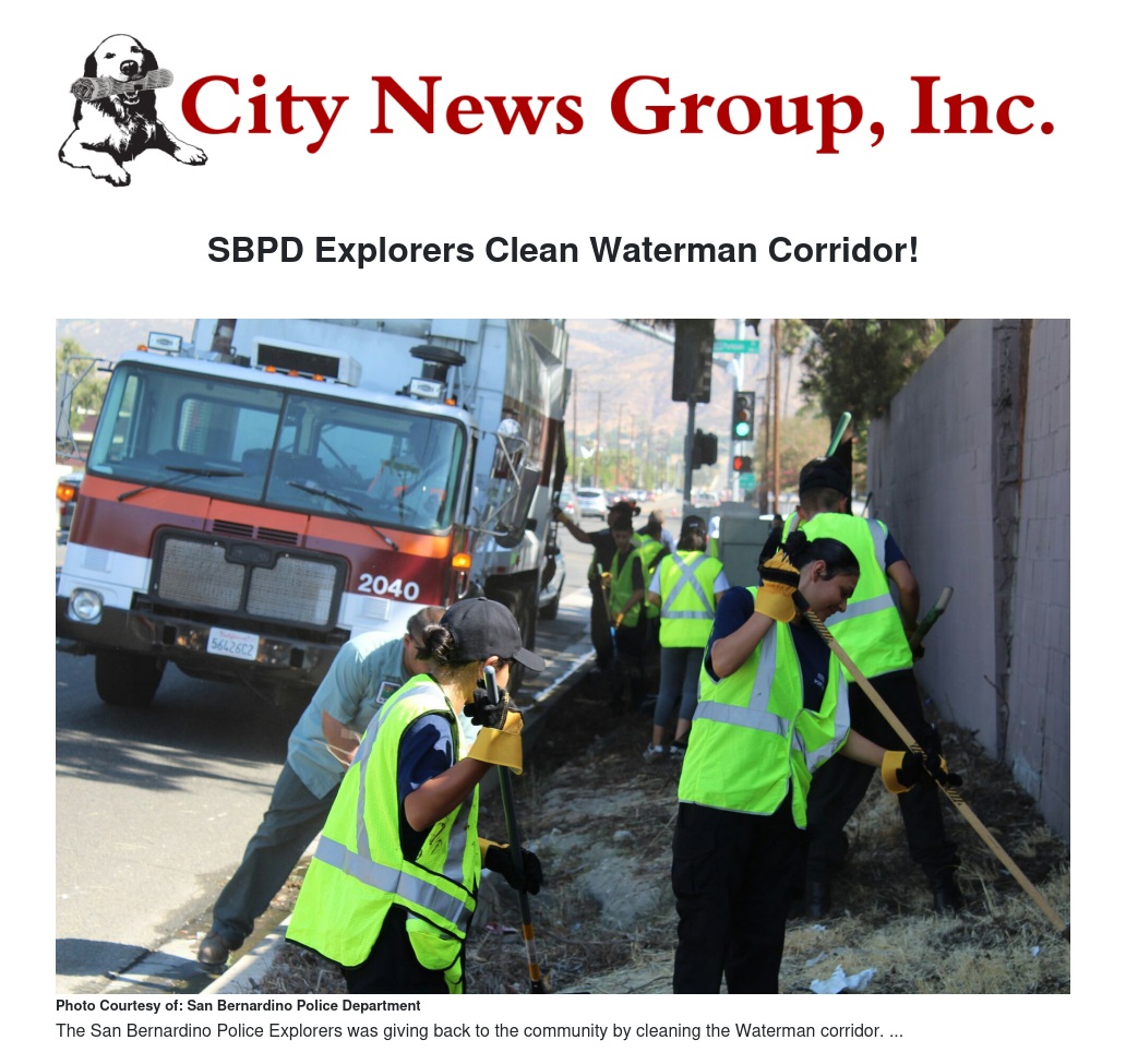 The San Bernardino Police Explorers spent a full day of their summer break giving back to the community by cleaning up the Waterman Ave. corridor between 30th and 40th Street during a time when temperatures reached 101 degrees. SBPD Explorers, who range in ages from 14-21, saw a need to clean up Waterman Ave., a street that acts as a gateway to those entering from, and exiting to San Bernardino from the mountain regions. Trash, debris, and overgrown landscaping blighted the area, and the teens, most of whom are San Bernardino City residents, sprang into action. With the support of Burrtec Waste and the City of San Bernardino Public Works, these kids hydrated and made the cleanup happen despite the heat. The San Bernardino Police Explorers are involved in a number of community service projects and have learned to take ownership of things that need to be done in their own city. Several neighbors and residents drove by the cleanup and, seeing the explorers in their bright green vests, offered positive comments about how they were changing the look of the neighborhood.