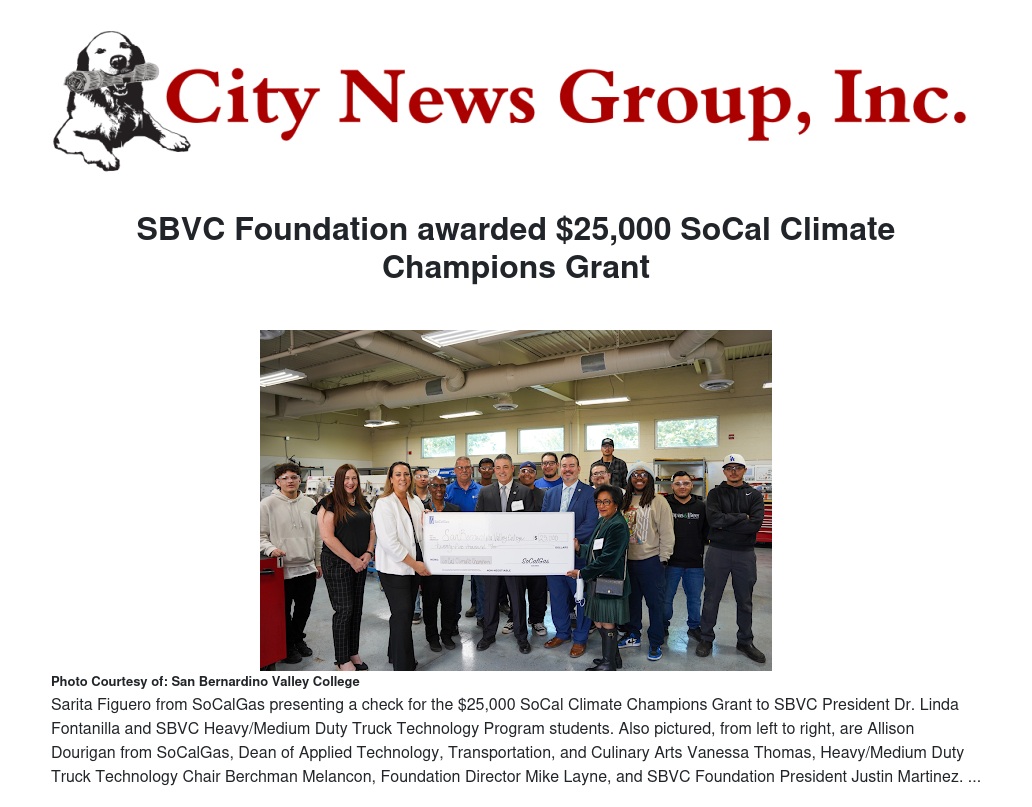 The natural gas utility company awarded the SoCal Climate Champions Grant to the SBVC Foundation in September 2023. The grant will aid in the purchase of additional training modules and classroom tools for a second lab section, supporting the growing interest and enrollment in the college's CNG/Clean Energy Training Expansion program.