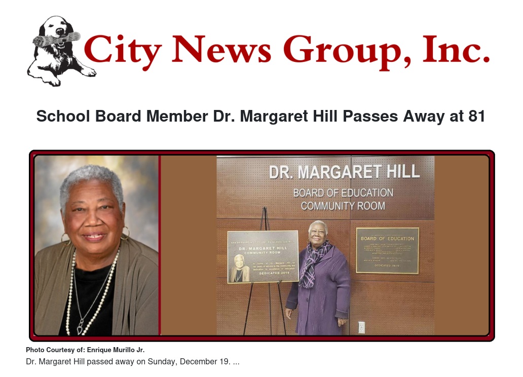 It is with deep sorrow we convey the death of Dr. Margaret Hill, community icon, leader, longtime San Bernardino City Unified school board member, and known by many as the "community mother for all." Hill passed away Sunday, December 19. She was 81.