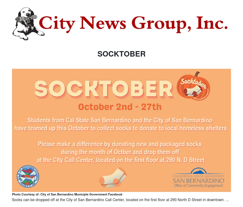 The City of San Bernardino has joined students from Cal State San Bernardino during the month of October for a "Socktober" sock drive to collect new and packaged socks to be provided for distribution at San Bernardino's homeless shelters.