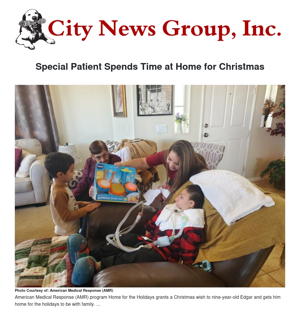 American Medical Response (AMR), Redlands Operations, was able to grant a Christmas wish this year to one pediatric patient. Nine-year-old Edgar is a quadriplegic and ventilator-dependent resident of Children’s Subacute Center – Community Hospital of San Bernardino. Edgar had the opportunity to go home for a few hours on Christmas Day to spend time with his family. AMR has participated in Home for the Holidays for over 2 decades, however, due to COVID, we were unable to provide this special Christmas wish until this year. While spending time with family is a tradition for most, for others, it can be very complicated without the resources of medical professionals. AMR is proud to partner with Children’s Subacute  Center to make this special visit happen.