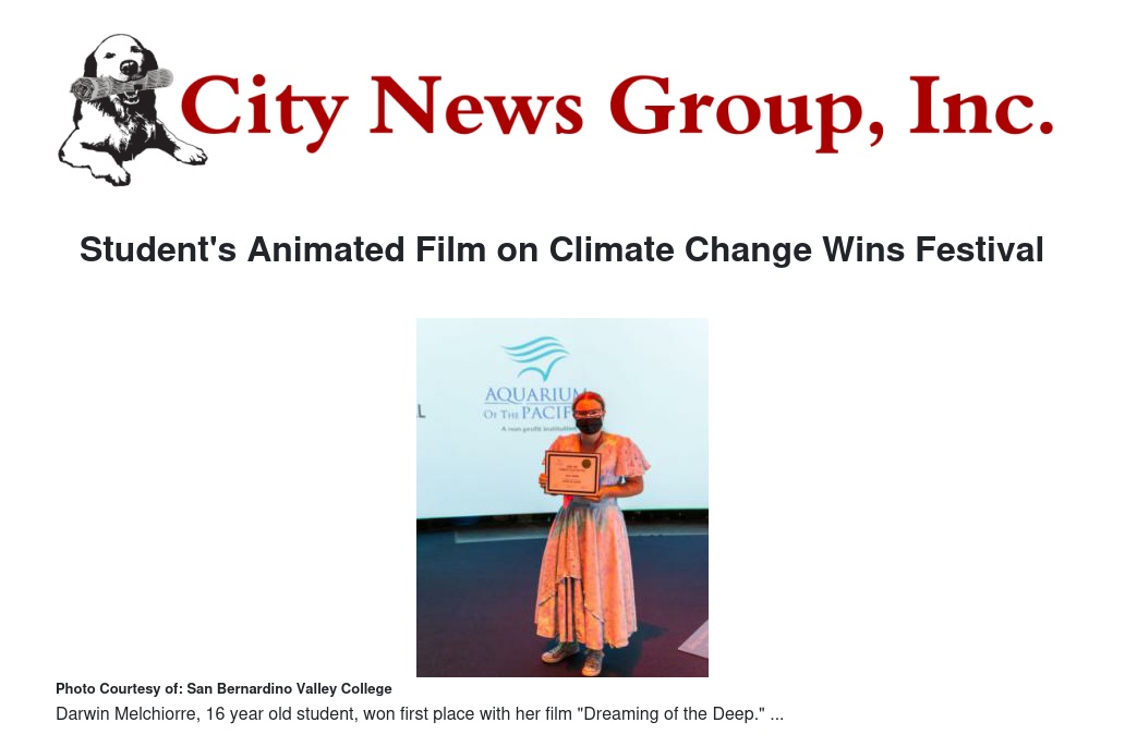 Melchiorre, a high school junior simultaneously enrolled in classes at San Bernardino Valley College (SBVC), entered her animated movie “Dreaming of the Deep” into the Aquarium of the Pacific's inaugural High Tide Student Film Festival in June. She was awarded first place in the “Thriving in a Changing Climate” category.