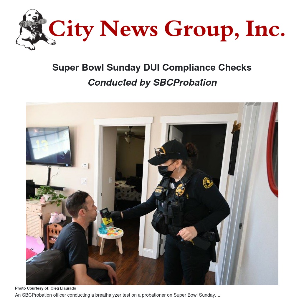 On Super Bowl Sunday, the San Bernardino County Probation Department visited supervised probationers with prior convictions for driving under the influence (DUI) offenses. During the 8-hour compliance operation, 55 home visits were conducted and 36 probationers were contacted, all of whom were found to be in compliance.
