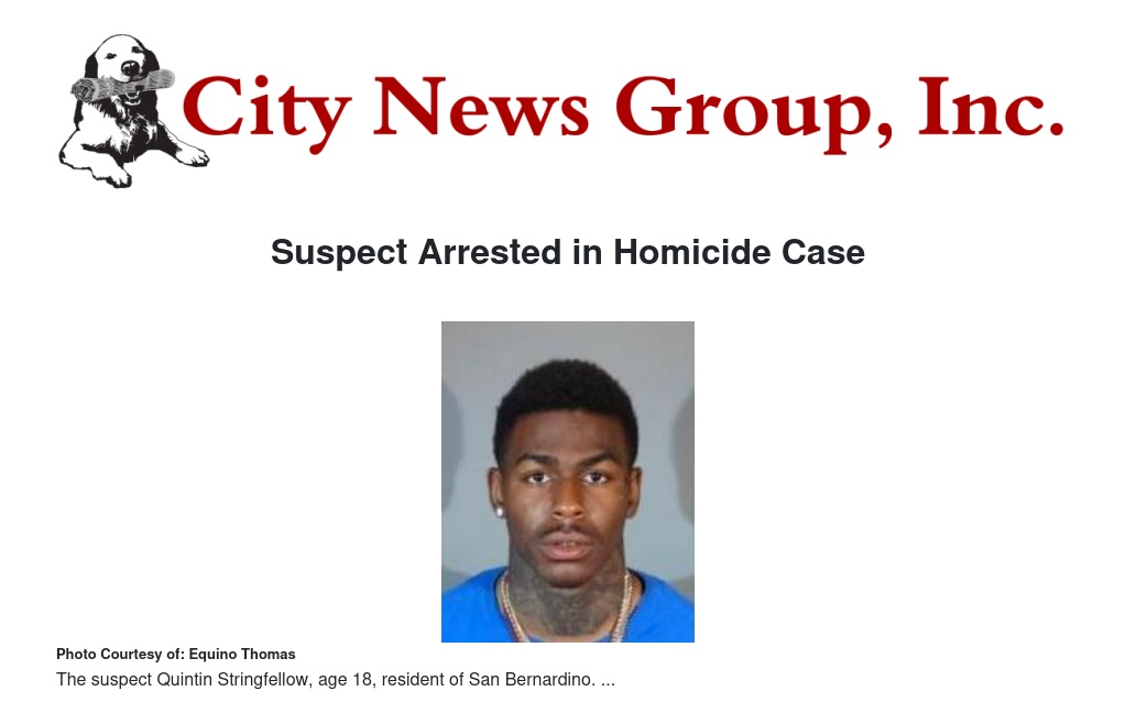 On February 16, 2022, investigators with the San Bernardino Police Department attempted to arrest Stringfellow on a murder warrant in the city of Redlands, CA. After a brief foot pursuit, Stringfellow was taken into custody and a handgun used in one of the murders was recovered nearby. The vehicle used in both murders was also located nearby. Stringfellow is a self-admitted PPHG gang member. Stringfellow was arrested on two counts of murder and was booked into a local jail facility.