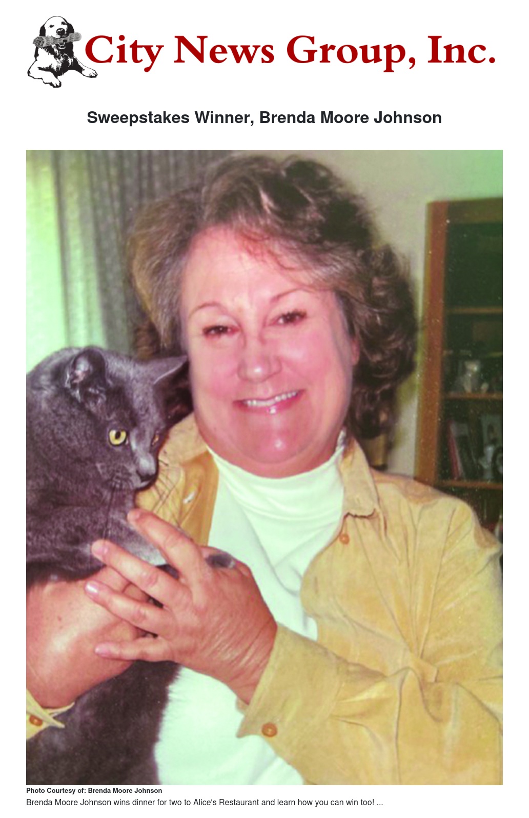 Brenda Moore Johnson is this week’s winner of the City News Group, Inc. $1,000 sweepstakes opportunity drawing! As this week’s winner of the weekly prize giveaway, Johnson has won a delightful dinner for two from local favorite, Alice’s Restaurant.