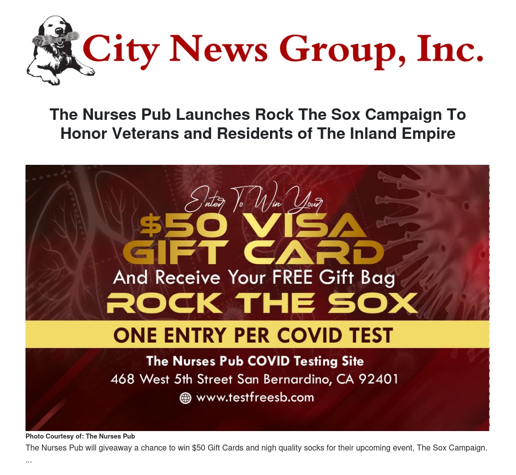With the support of Bombas.com, Wesley Health Centers (also known as the JWCH Institute), and Operation Be Kind, The Nurses Pub will launch a community giveaway to support San Bernardino, Inland Empire Veterans, and families needing high-quality socks. With a chance to win $50 Visa Gift Cards, guests have access to 500 pairs of socks and a complimentary Nurses Pub goodie gift bag with COVID testing on November 11-12, 2022, at the testing site.