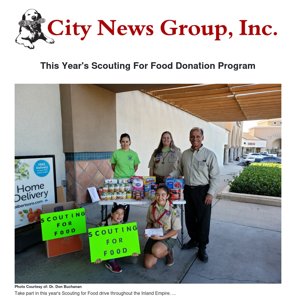 The Boy Scouts of America invite you and your neighbors to support your local food pantries on Saturday, November 12th this fall. Smiling Scouts will greet you while you shop at local grocery stores in the Inland Empire communities from Grand Terrace and Loma Linda to Banning Pass along the I-10 corridor, as well as within San Bernardino and Highland below the mountains. Mountain Scout units will be out too in Lake Arrowhead, Blue Jay, and Crestline. “Scouting for Food” has been an annual “Good Turn” community service program performed by Scouts of all ages in the California Inland Empire Council since 2001.