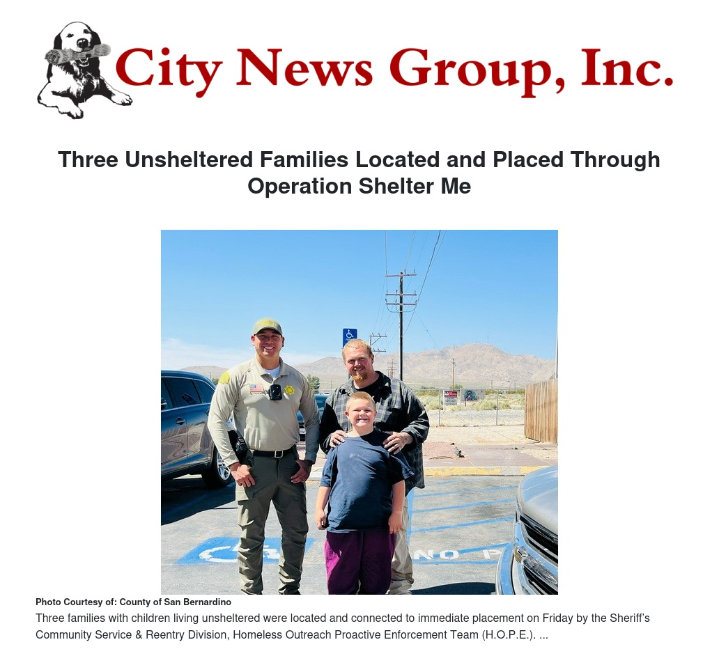 Three families with children living unsheltered were located and connected to immediate placement on Friday by the Sheriff’s Community Service & Reentry Division, Homeless Outreach Proactive Enforcement Team (H.O.P.E.).