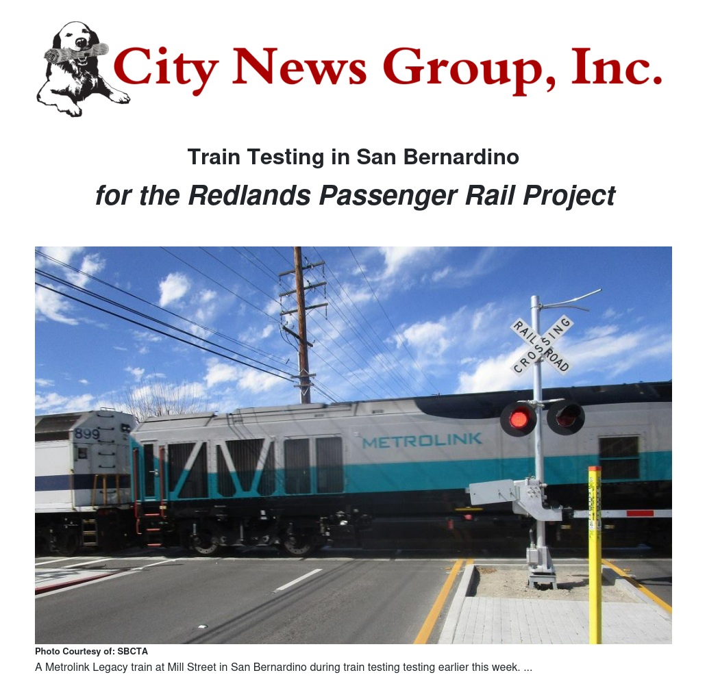 Nighttime train testing (10:00 p.m. to 6:00 a.m.) of the DMU trains is tentatively scheduled to occur in the City of San Bernardino on Friday, March 25 and Saturday, March 26 (into Sunday morning).