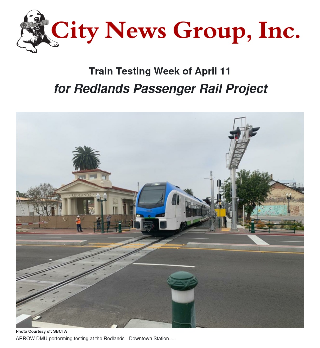 Train testing throughout the 9-mile Arrow corridor has begun and will continue until service starts later this year. Metrolink and DMU trains are being used to test the tracks, signals at the crossings, and communication systems.