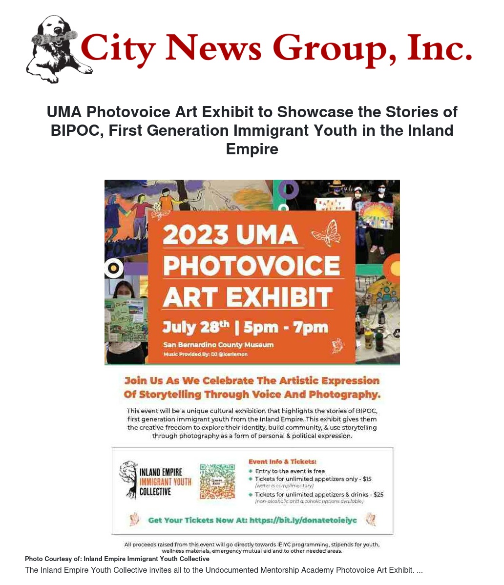 The Inland Empire Immigrant Youth Collective (IEIYC) is thrilled to announce the highly anticipated Undocumented Mentorship Academy Photovoice Art Exhibit, a transformative event that aims to amplify the narratives of BIPOC, first-generation immigrant youth residing in the Inland Empire. This remarkable exhibition will take place at the San Bernardino County Museum on Friday, July 28, 2023, from 5 pm - 7 pm.