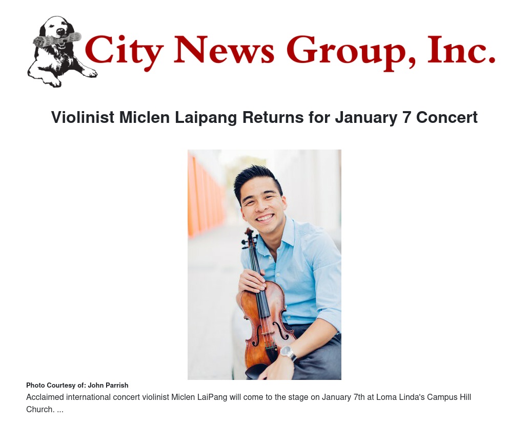 Violinist Miclen Laipang Returns for January 7 Concert by John Parrish - City News Group, Inc.