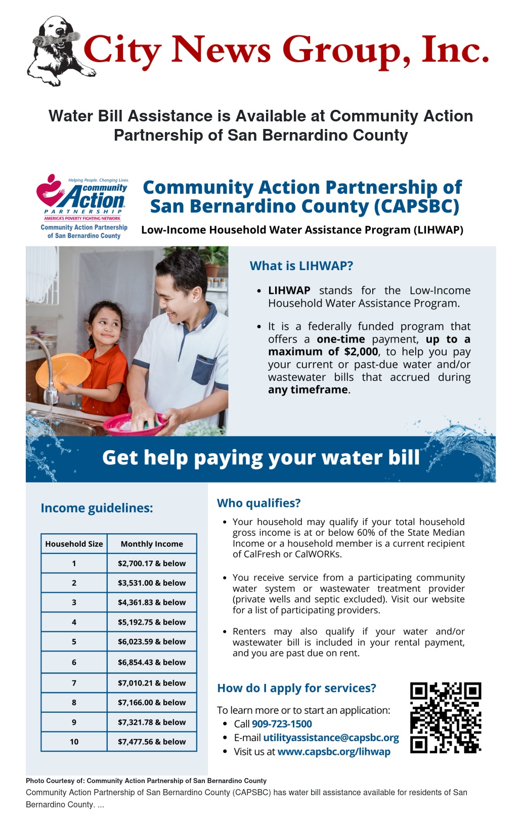 Community Action Partnership of San Bernardino County (CAPSBC) is helping residents with their water or wastewater bill(s) through its Low-Income Household Water Assistance Program (LIHWAP).