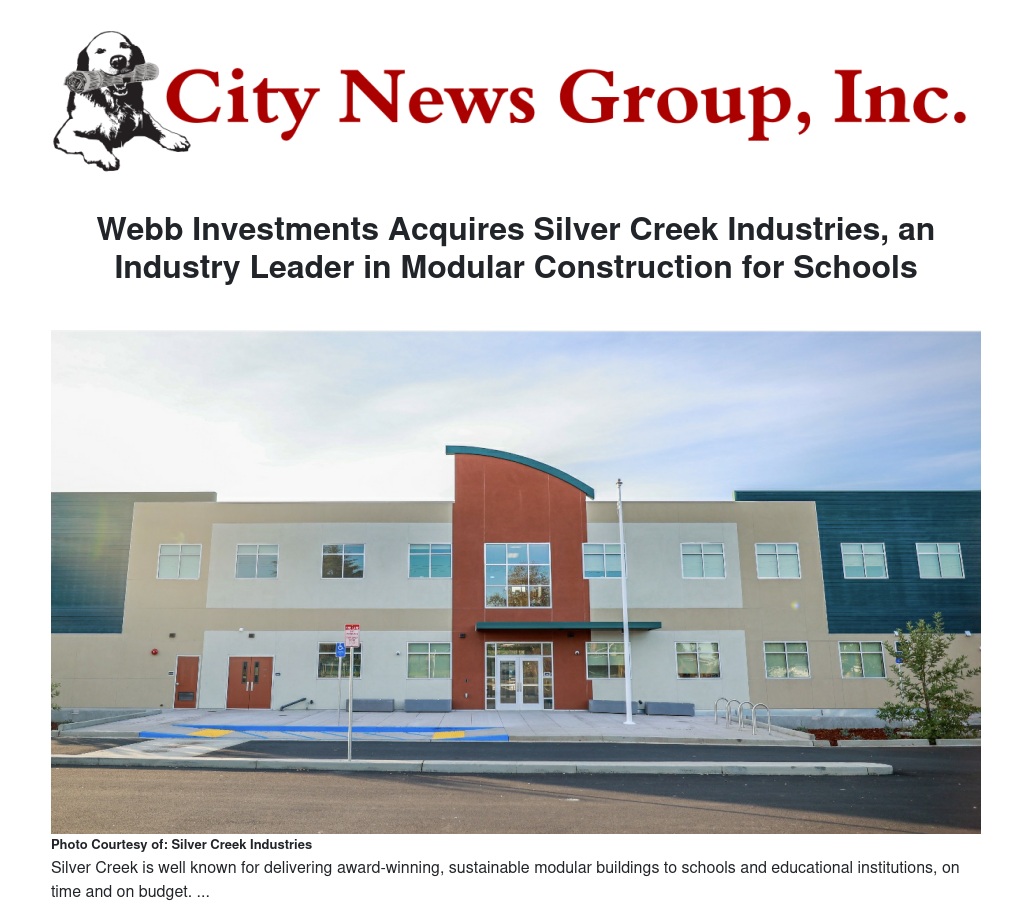 Webb Investments today announced the launch of a new company, Silver Creek Modular, after acquiring the assets of Silver Creek Industries, a highly respected modular construction company known for bringing innovative, sustainable, and cost-effective solutions to the education industry.