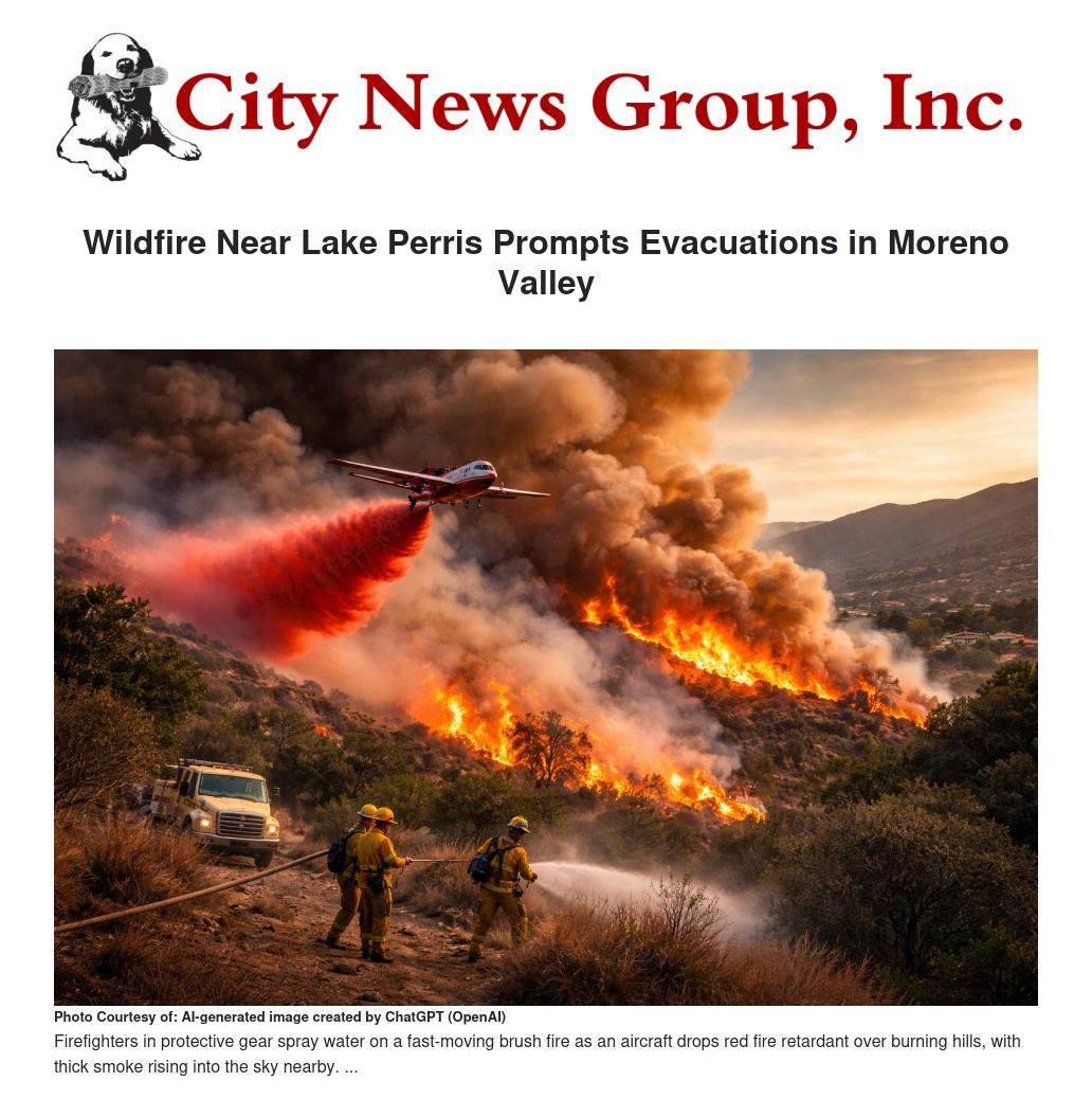 Wildfire Near Lake Perris Prompts Evacuations in Moreno Valley by Stella Pierce - City News Group, Inc.